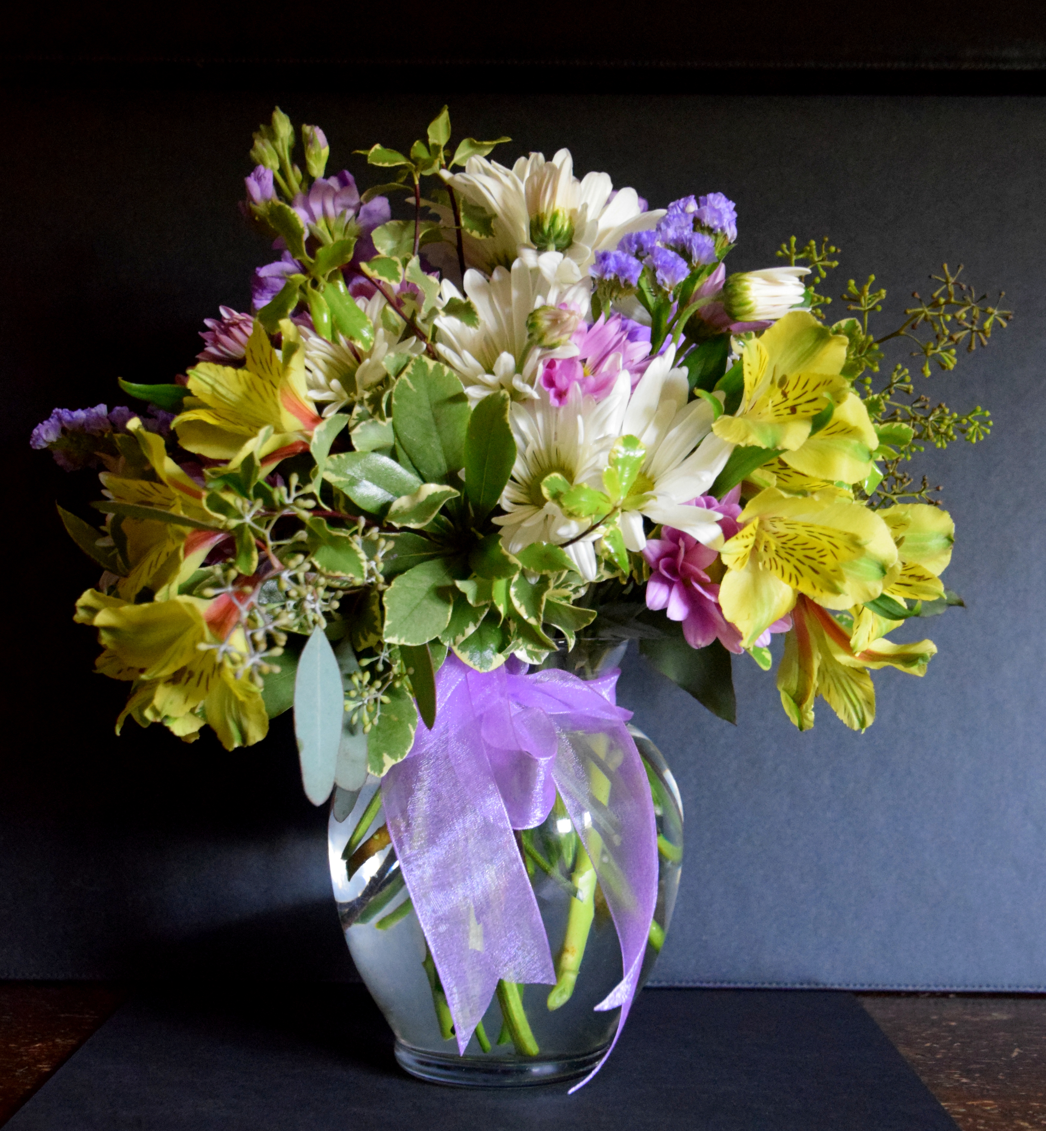 Beautiful Sandy. The simplicity of the glass vase and purple ribbon add so much the beauty of the floral arrangement. Thank you for sharing.