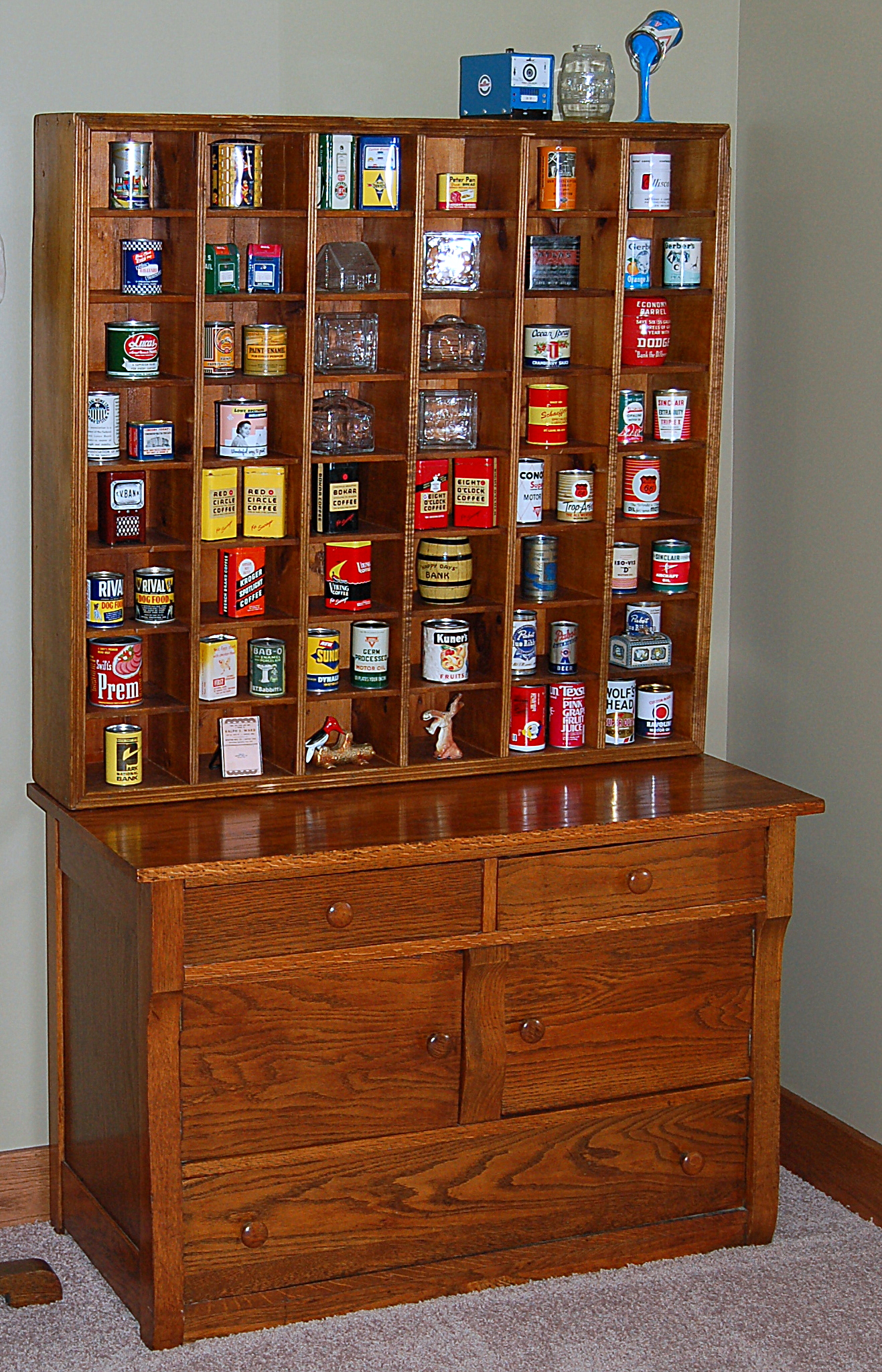 The little cubbies work perfectly for arranging. I like the little glass house bank in the second row from the top. My husband just added another to the group this past weekend.