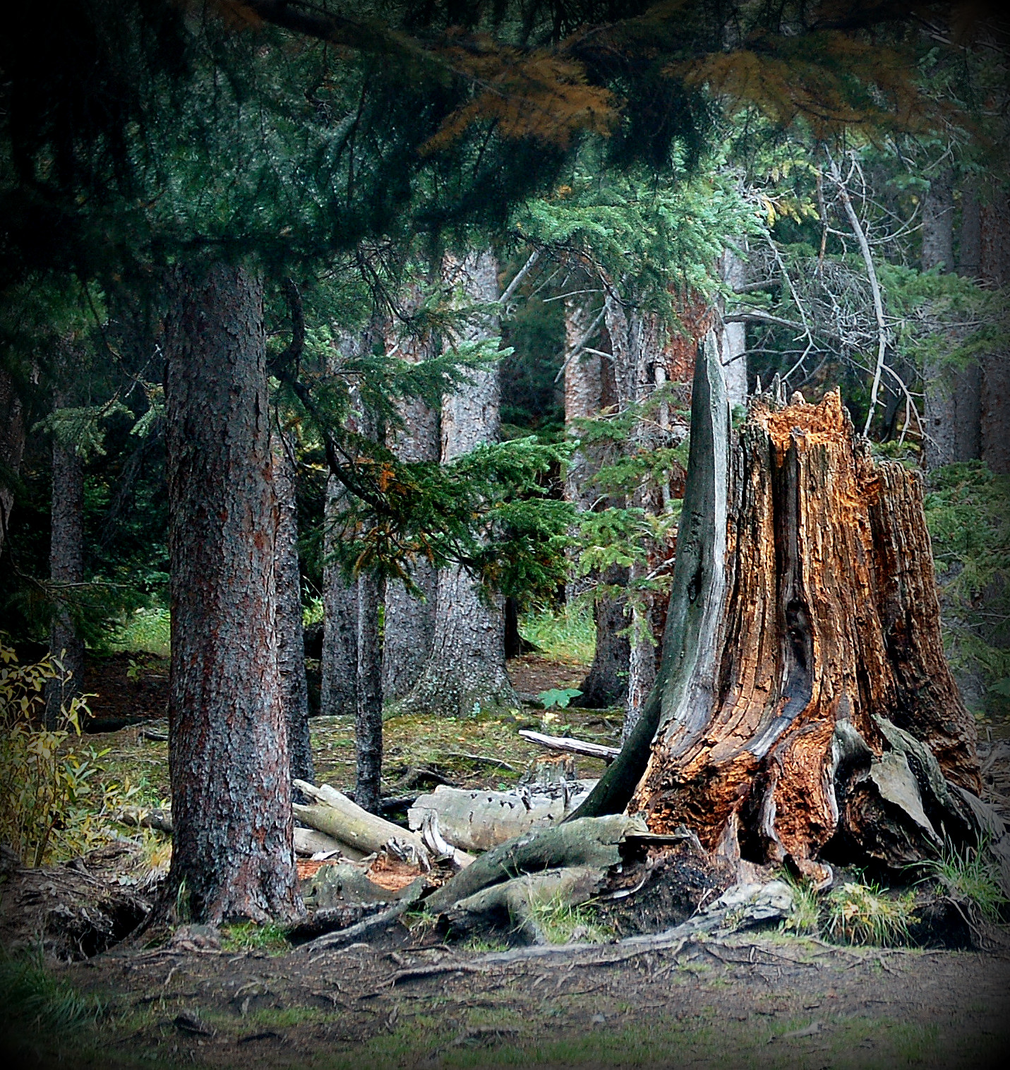 lovely… the placement of the stump on the right of the image, how its powerful presence is balanced by the other trees on the left. The vignetting that offers the impression of looking in through a window into this clearing. mmmmmm yummy! An image I would want to see on a poster.