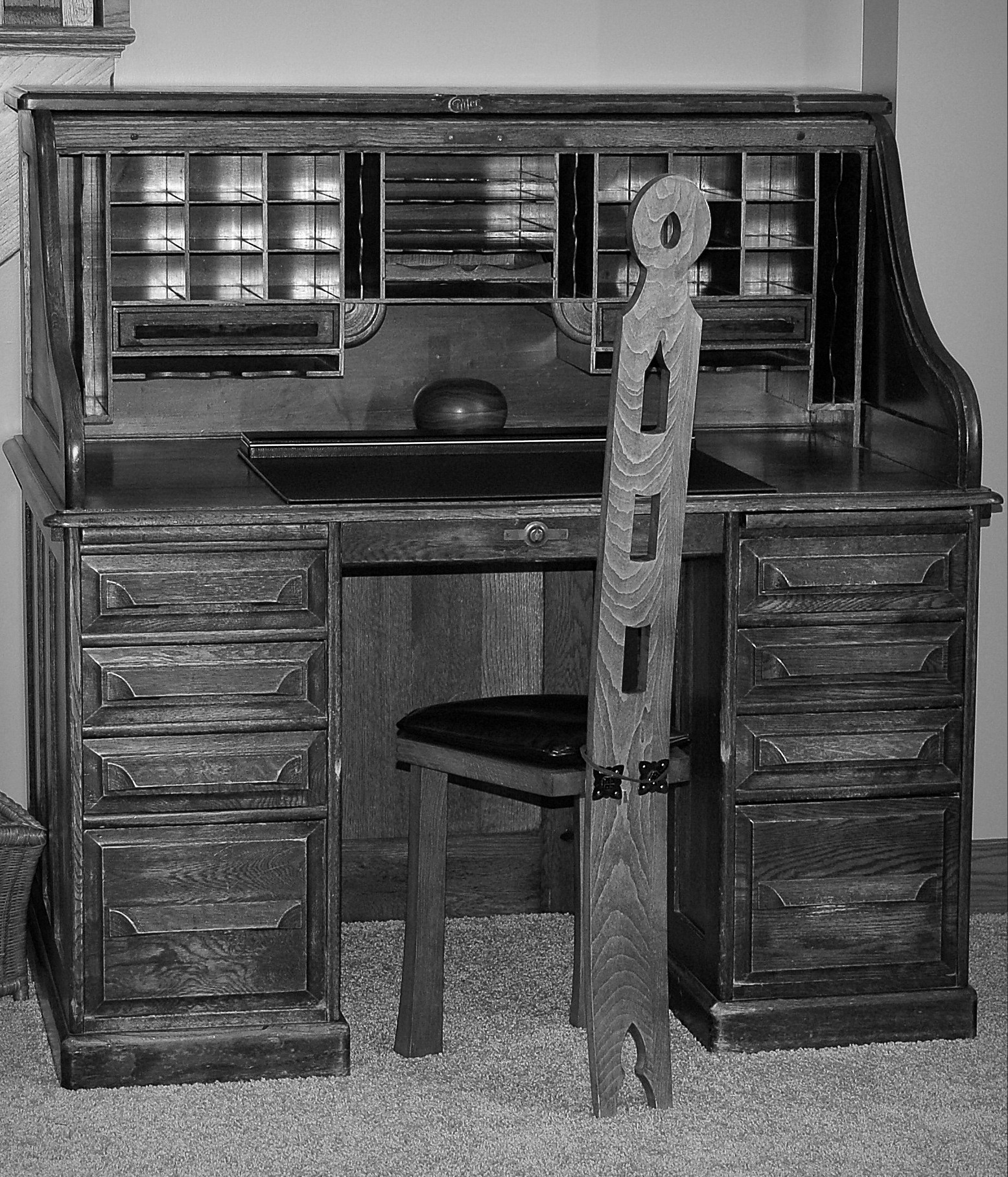 • My sister used that chair when she played the piano. It always looked very uncomfortable to me. I have an antique oak office chair that goes with the desk, but it takes too much room in the house. The desk is sizable, also, but I couldn’t part with it when I retired.